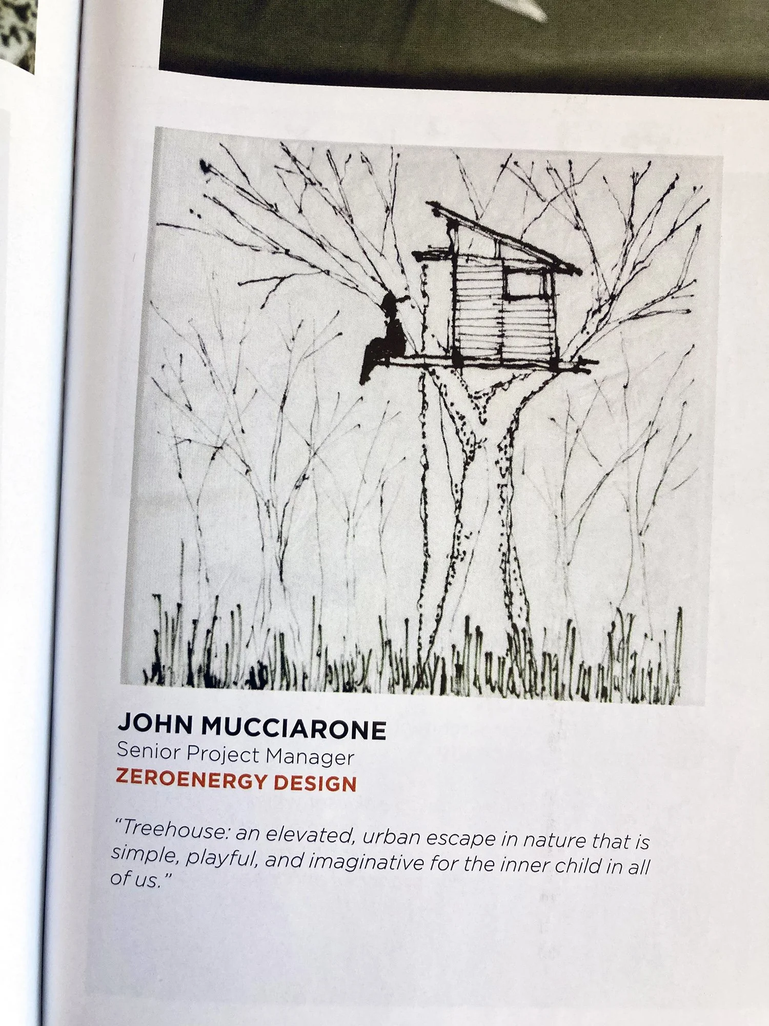 Participants created sketches inspired by prompts like designing a downtown Portland train station, a structure based on a favorite board game, a children's play fort/treehouse, an adaptive reuse for an old space, or a reimagined Adirondack chair. John’s submission was titled “Treehouse: an elevated, urban escape in nature that is simple, playful, and imaginative for the inner child in all of us.”